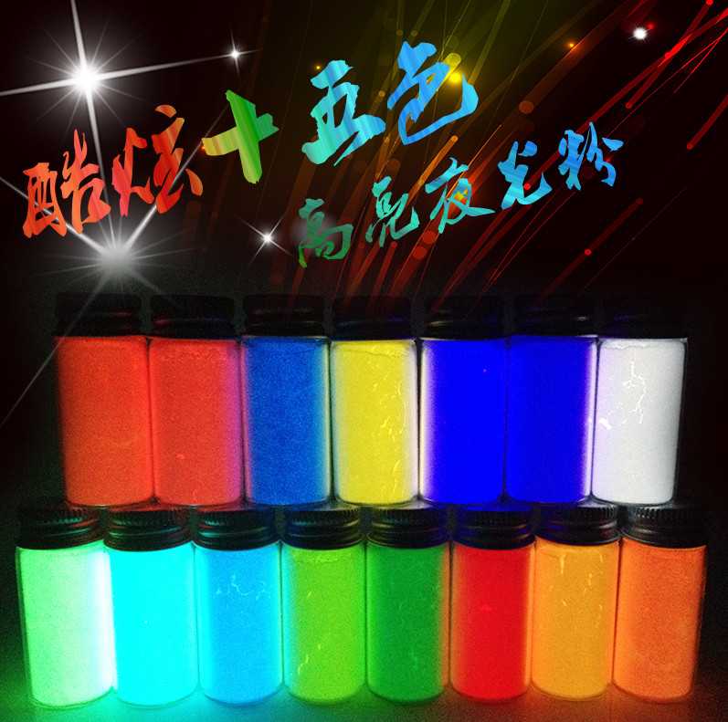 點擊:夜光粉是一種用途非常廣泛的顏料,服裝印花、玩具注塑、涂料顏料、夜光油墨、夜光指甲油等等都可以添加夜光粉。夜光粉先吸收各種光和熱,轉換成光能儲存,然后在黑暗中自動發光,并可無限次數循環使用。那么你知道夜光粉的顏色有多少種嗎?