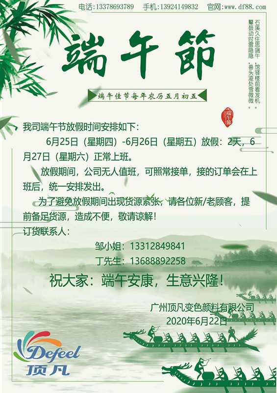 點擊:時間飛逝,轉(zhuǎn)眼間又是一年端午時,又聞粽飄千里香,2020的端午佳節(jié)即將到來。廣州頂凡公司向全體員工及各位新老客戶致以節(jié)日的問候,為了度過歡樂、祥和的端午節(jié),公司放假時間為:6月25-26日、27號正常上班,放假期間,可照常接單,如需訂貨可聯(lián)系鄒經(jīng)理:13312849841。